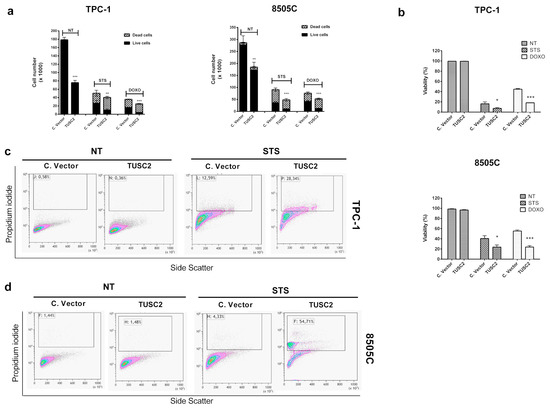To this aim, transfected cells were treated with doxorubicin (1 µM) or with staurosporine (2.5 µM) and counted with trypan blue after 48 and 24 h, respectively. As shown in Figure 4a,b, treatments with staurosporine and doxorubicin in 8505C/TUSC2 and TPC-1/TUSC2 cells reduced the cell number (a) and cell viability (b) in comparison to that in control cells.