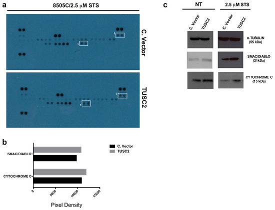 TUSC2 forced expression increased SMAC/DIABLO and CYTOCHROME C protein levels. (a) 8505C cells stably transfected with TUSC2 or with Control Vector (C. Vector) were treated for 24 h with 2.5 µM STS, and then 400 µg of protein lysates were blotted on the Proteome Profiler Human Apoptosis Array nitrocellulose membrane purchased from R&D Systems. Spots highlighted and labelled as #1 refer to SMAC/DIABLO and as #2 refer to CYTOCHROME C proteins. (b) Quantification of pixel intensities was performed with the ImageJ software programme (version 1.50i) and each protein is represented as the average signal (pixel density) of a pair of duplicate spots. Pixel density was normalized by subtracting the average background signal. (c) Western blot for SMAC/DIABLO, CYTOCHROME C and TUBULIN proteins in an independent cell lysate of transfected 8505C cells untreated (NT) or treated with STS.