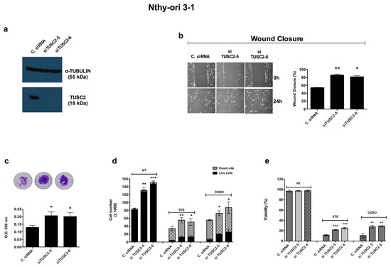 Finally, in order to verify the results obtained for the role of TUSC2 in the apoptotic process of thyroid cancer cells, a trypan blue assay was performed in Nthy-ori 3-1 cells transfected with siRNAs targeting TUSC2 (siRNA TUSC2-5, siRNA TUSC2-6) or with Control siRNA and treated with doxorubicin and staurosporine. Silencing of TUSC2 in treated cells induced resistance to apoptosis by increasing the cell number (Figure 6d) and cell viability (Figure 6e) compared to those of the corresponding control cells.