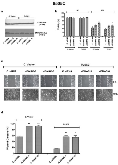 Then, we asked whether silencing of SMAC/DIABLO in 8505C/TUSC2 and control cells could restore the biological phenotype of TUSC2. Figure 7a shows the silencing efficiency of SMAC/DIABLO (by using two different siRNAs, 5 and 6) in 8505C/TUSC2 and 8505C/C. vector cells. As shown in Figure 7b, silencing SMAC/DIABLO partially rescued the effects induced by TUSC2 on cell viability after staurosporine treatment. Additionally, Figure 7c,d shows that silencing SMAC/DIABLO partially rescued the effects induced by TUSC2 on cell migration.