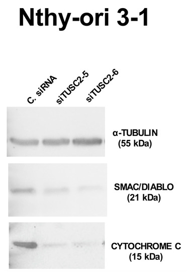 Finally, we confirmed these results also in Nthy-ori 3-1 cells. We first evaluated the expression levels of the identified apoptotic proteins after TUSC2 silencing and found that, in Nthy-ori 3-1 cells silenced with both TUSC2 siRNAs, SMAC/DIABLO and CYTOCHROME C levels decreased compared with those in cells transfected with control siRNA (Figure 8).