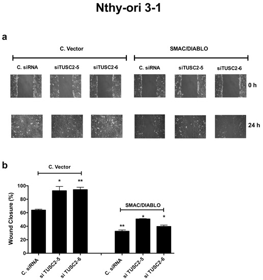 SMAC/DIABLO partially rescued the TUSC2 induced phenotype in the Nthy-ori 3-1 cell line. Nthy-ori 3-1 cells were transiently transfected with two different siRNAs (siTUSC2-5 or siTUSC2-6) or with Control siRNA (named C. siRNA) for 24 h, and then transfected with a SMAC/DIABLO plasmid or Control Vector. Then a wound was generated on the confluent monolayer of transfected cells. Cells were imaged under a microscope at 10x magnification (a) and the wound closure distance was quantified and expressed as the percentage of wound closure (b). Values represent the average of duplicate experiments ± standard errors. * p < 0.05 and ** p < 0.01.