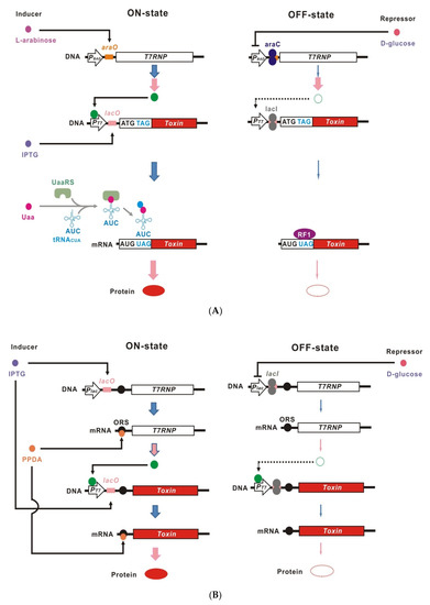 Incorporation of a site-specific unnatural amino acid (Uaa) into ribosomally synthesized proteins in vivo at a position encoded by an amber stop codon [16,17,18,19,20] was originally developed for structural analysis, labeling, chemical ligation, and functional modification of proteins through the replacement of canonical natural amino acids [16,17,18]. Site-specific Uaa incorporation can also be used to control translation of target mRNA (Figure 1A) [21,22,23,24]. Typically, amber stop codons are inserted near the translation initiation site of the coding region of target genes. Genes encoding the UAA-specific aminoacyl tRNA synthetase (UaaRS) and the cognate tRNACUA are also introduced into the host bacteria. Once the Uaa is provided in the culture medium, it is taken up into the intracellular space and then incorporated in proteins at the inserted amber stop codons, causing full-length translation of target mRNAs by amber stop codon read through (ON-state). In the absence of Uaa, translation is interrupted at the inserted amber stop codons, resulting in inhibition of functional target protein production (OFF-state).