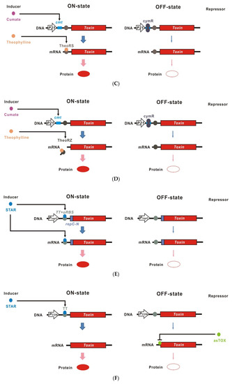 Ribozymes are RNAs with catalytic activities [46,47], and some ribozymes are activated by binding of specific ligands. Theophylline ribozyme is a hammerhead ribozyme that recognizes and site-specifically digests a specific RNA sequence [48], and is activated in the presence of theophylline. Gene expression can be controlled at the translational level using this ribozyme. This control element, in which a complementary sequence to the RBS inhibits translation and the theophylline ribozyme, is inserted in the 5′UTR near the translation initiation site. Theophylline ribozyme removes this control element by self-digestion in the presence of theophylline, resulting in release of the RBS and translation initiation of mRNA. A dual control system using cumO/R and theophylline ribozyme was reported in 2016 (Figure 1D) [41]. No leakage expression was detected using a gusA expression construct regulated by this dual control system.