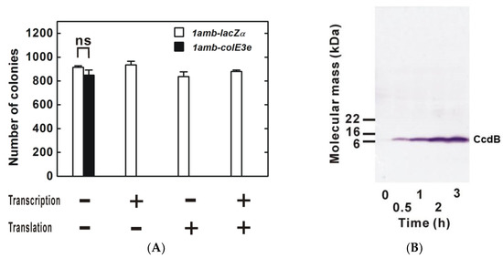 In 2014, the HYZEL (High-Yield and ZEro-Leakage) dual transcription-translation control expression system using Uaa incorporation was reported in E. coli (Figure 1A) [21]. In HYZEL, transcription of a toxic gene is controlled through a cascade under the T7 promoter (PT7) with lacO/I in the host bacterium BL21-AI, in which T7 RNA polymerase (T7RNP) is conditionally expressed under the control of PBAD and araO/C. The recombinant toxic protein is produced in the presence of L-arabinose, IPTG and Uaa (ON-state), whereas production is suppressed in the absence of these inducers and the presence of D-glucose, which causes catabolite suppression (OFF-state). HYZEL with translation of the toxic protein controlled by ZK incorporation tolerated an expression construct for ColE3e containing a single amber stop codon insertion, which suggests that leakage expression is almost zero (Kato Y, unpublished data, Figure 2A), while the yield of recombinant protein was not affected by insertion of 1 or 2 amber stop codons [21]. In addition, the DNA gyrase inhibitor, CcdB, a well-known toxic protein to E. coli, has been successfully produced using HYZEL (Kato Y, unpublished data, Figure 2B).