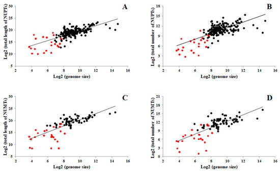Correlation analysis between nuclear genome size and nuclear integrants of plastid DNA (NUPT)/nuclear integrants of mitochondrial DNA (NUMT) content or number in plants: (A) genome size versus cumulative length of NUPTs; (B) genome size versus total number of NUPTs; (C) genome size versus cumulative length of NUMTs; (D) genome size versus total number of NUMTs. This dot-plot was generated based on the data presented in Tables S1 and S2. The red dots indicate the results of algal plant analysis, whereas the black dots represent those of analysis involving other plants, most of which are flowering plants.