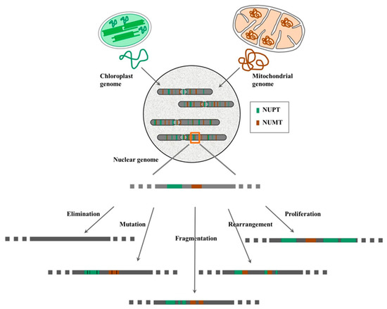 Three genetic compartments coexist in the plant cells: the nucleus and two cytoplasmic organelles, namely, chloroplast (plastid) and mitochondria. Among these cellular parts, the nucleus harbors the majority of the genetic material, and chloroplast and mitochondria contain relatively little but essential genetic substance. It is widely accepted that chloroplasts and mitochondria in eukaryotic cells are descended from erstwhile free-living organisms (α-proteobacteria and cyanobacteria) by endosymbiosis more than a billion years ago [1,2,3]. When the three genetic compartments were involved in one cell, genetic flux among them occurred frequently [4,5,6]. In theory, there are six types of DNA transfer occur among the three genetic compartments. At least five types, including mitochondrion-to-nucleus, plastid-to-nucleus, plastid-to-mitochondrion, nucleus-to-mitochondrion, and mitochondrion-to-plastid DNA transfer, have been observed presently based on experimental and bioinformatics data [4]. The transfer frequency is remarked different among the different types of genetic flow. Mitochondrion and chloroplast DNA have been integrated to the nuclear genome with high frequency, whereas other types of transfer occur rarely. In fact, along with the evolutionary process of the plastid and mitochondrion, many genes have relocated from the organelle to host nuclear genomes. Such events combined with the deletion of dispensable organelle genes considerably reduced the genome size of the mitochondrion and plastid during the evolution from their progenitors [4,7]. Organellar DNA transfer into the nuclear genome not just occurred during the establishment of symbiosis; it still actively occurs continuously [8,9,10,11,12,13]. The organelle-derived DNAs in the nucleus are designated as nuclear integrants of plastid DNA (NUPTs) and nuclear integrants of mitochondrial DNA (NUMTs). The NUPTs and NUMTs discussed here refer to the nuclear organellar DNAs, which still have homologous copies in the organelles and do not include the relocated organellar genes that were previously reviewed [4,7,14].