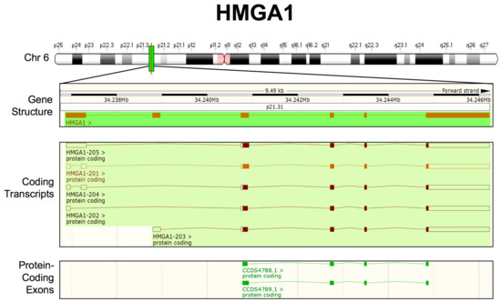 Currently, whole-genome sequencing projects, together with transcriptome analysis, can provide a more complete picture of transcripts that originate from a specific locus. Starting from this consideration, we investigated whether new coding transcripts can arise from the human HMGA1 gene. We used Ensembl Genome Browser 96 for this purpose, which collects open-access, integrated genome, gene, variation, gene regulation, and comparative genomic information [183] (Figure 1). This analysis did not reveal further complexity in HMGA1 transcripts; therefore, we can conclude that all of the transcripts share the same 3′UTR and can thus be targeted by the same miRNAs.