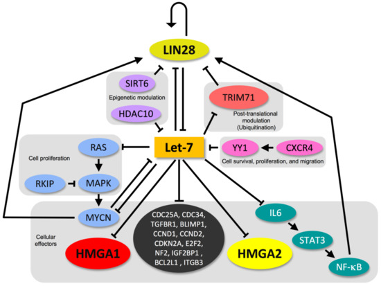 The factors controlling let-7 expression form a regulatory feedback loop with downstream targets of let-7 and are pivotal regulators of stemness or differentiation. The major molecules regulating let-7 are the two RNA-binding proteins LIN28A and LIN28B, [217], which recruit terminal uridyltransferase (TUT4) and add an oligomeric U at the 3′ end, which prevents pre-let-7 from being processed into a mature miRNA [218]. Strikingly, the LIN28 proteins dramatically affect HMGA1 and HMGA2 through both let-7-dependent and let-7-independent mechanisms [195]. The components of this network are linked by entangled positive and negative reciprocal regulatory activities that each factor exerts on the other factors and on itself (Figure 3) [219].