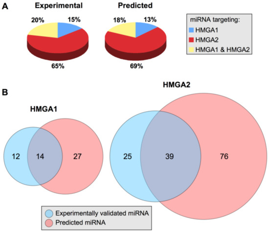 An overview of HMGA1- and HMGA2-targeting miRNAs. (A) Comparison of the percentage distributions of experimentally validated and predicted HMGA1- and HMGA2-targeting miRNAs. (B) Venn diagrams of experimentally validated and predicted miRNAs targeting HMGA1 and HMGA2.