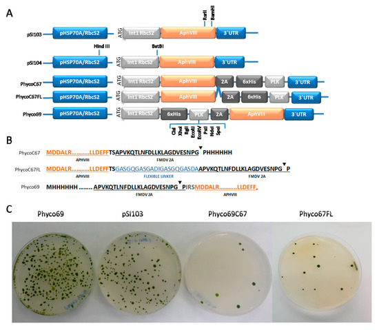 Schematic diagram of the main elements of the three new plasmids generated in this work in comparison with the control pSI103 plasmid (A) and of the translation products resulting from them (B). The blue line “^“ represents the flexible peptide sequence GASGQGASGADIGASGQGASDA. “▼“ denotes the hydrolysis point in the self-cleaving peptide FMDV-2A. Representative examples of the nuclear transformation of Chlamydomonas reinhardtii with the three newly generated plasmids (Phyco69, PhycoC67, and PhycoC67FL) and the control pSI103 plasmid are also shown (C).