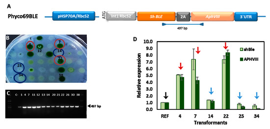 To confirm this, we studied the expression levels of APHVIII and ShBLE in a series of transformed clones obtained with the Phyco69BLE plasmid (Figure 3A). The correct simultaneous insertion of both, APHVIII and ShBLE genes, in the genome of the selected clones, was checked by PCR with specific primers that anneal at the end of the ShBLE gene and at the beginning of the APHVIII gene. All the clones checked had incorporated both genes correctly in their genomes (Figure 3C).