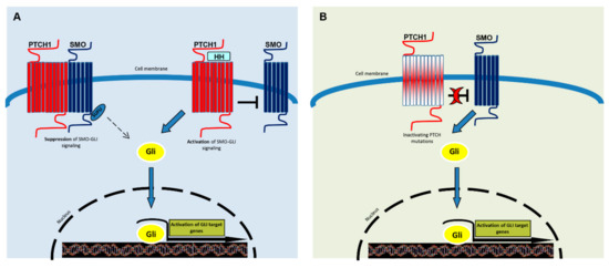 A simplified representation of the Hedgehog signaling pathway. SMO is the key signal transducer of the Hh pathway. (A) In the absence of Hedgehog (Shh, Dhh, Ihh) ligands, PTCH1 inhibits SMO signaling. Gli molecules are processed with the help of SuFu molecules into repressor forms, which disable the Hh signaling pathway. The binding of Hh promotes SMO conformational change, leading to activation of the GLI transcription factors (the activators Gli1 and -2 and the repressor Gli3). Activated GLI accumulates in the nucleus and controls the transcription of hedgehog target genes. (B) Mutated PTCH1 does not inhibit SMO and the pathway results activated, as in the presence of ligands.