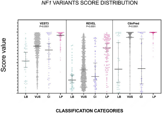 First, we extracted the VEST3, REVEL and ClinPred scores for 1585 NF1 missense variants (49 BENIGN/LIKELY BENIGN, 1364 VUS, 50 CI, and 122 LIKELY PATHOGENIC/PATHOGENIC) deposited at ClinVar. Next, we verified whether VEST3, REVEL and ClinPred scores for the classes “likely benign” vs. “benign”, and “likely pathogenic” vs. “likely pathogenic/pathogenic” vs. “pathogenic” were significantly different.