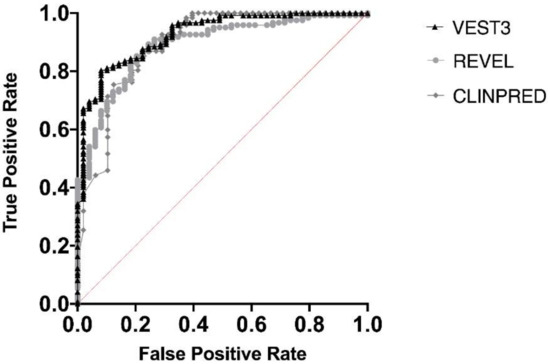 Next, we measured the area under the receiver operating characteristic (AUC) curves for all the three metapredictors. VEST had the highest AUC (0.9252) followed by ClinPred (AUC = 0.8939) and REVEL (AUC 0.8896) (Figure 2).