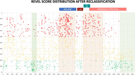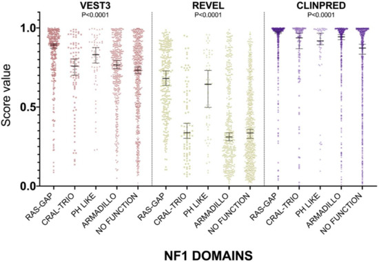 In addition, the score medians in the RAS-GAP domain of neurofibromin were significantly higher compared to medians of scores in other functional domains and in protein regions where no functions have been assigned yet (VEST3 median = 0.892, REVEL median = 0.6805, ClinPred median = 0.974). The only exception was represented by the PH-Like pleckstrin domain where the score medians, for all metapredictors, were not significantly different, although slightly lower than medians in the RAS-GAP domain, (Table 3).