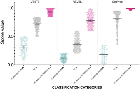 We obtained a much sharper separation between the LEANING BENIGN, VUS, and LEANING PATHOGENIC categories scores for all the three prediction tools. Further, we were able to halve the number of VUS variants (down to 51.5% with ClinPred, 52% with REVEL, and 52.6% with VEST3), while only a marginal number of variants switched to the opposite classification category (6 in VEST3, 11 in REVEL and in ClinPred).
