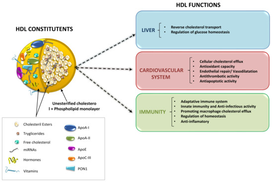 In summary, HDLs are complex particles constituted by a vast array of lipids, proteins, hormones, vitamins, and miRNAs, which confer HDL particles with multiple cardiovascular protective properties mainly related to atherosclerosis development. Advances in our outstanding on the structural components of HDL particles in different physiological and pathological conditions (HDL-remodeling) have allowed us to better understand the potential changes that may account for the loss of HDL function. Moreover, it has provided us with potential targets amenable for therapeutical modulation to restore HDL functionality or enhance specific protective features. In this regard, the implementation of new platforms aimed at designing and developing different reconstituted HDL formulations has offered a unique opportunity to overcome HDL-related structural alterations in the presence of co-morbid conditions or risk factors as well as to deliver drugs to target cells accurately. There is, however, much work that needs to be done in the arena of HDL-nano synthesis to obtain HDL constructs that remains stable and effective over time in the body and more closely resemble the healthy and native HDL particles endowed with multiple cardiovascular benefits (Table 1) [114].