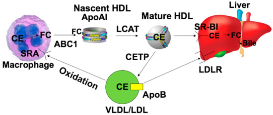Recent failures of CETP inhibition aimed at increasing HDL-C levels to decrease the risk of CVD have shifted the focus of HDL research towards a better understanding of mechanisms to preserve HDL function(s), rather than raising HDL-C levels. HDLs mediate the transport of cholesterol from peripheral tissues to the liver from which it can be secreted as bile acid, the process of which is known as reverse cholesterol transport (RCT). There are basically three steps in this process: (1) cholesterol efflux, where apoAI and HDLs interact with ABCA1 and ABCG1 to remove excess cholesterol from lipid-enriched macrophages as shown in Figure 1; (2) lipoprotein remodeling after accepting cholesterol and HDLs with structural modifications; and (3) cholesterol uptake by scavenger receptor class B type I (SR-BI) expressed in the liver, where cholesterol is converted into bile acid for the final excretion into bile and feces [43,44].