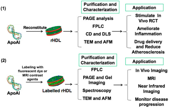 Proteomic studies found HDLs contain hundreds of proteins and lipids [10]. Therefore, HDLs are highly heterogeneous. Using rHDLs as a tool allows us to better understand HDL composition and its roles in CVD. rHDLs are synthesized by the combination of apoAI and phospholipids (Figure 2). The biochemical properties of the rHDL particles are determined using transmission electron microscopy (TEM), atomic force microscopy (AFM), dynamic light scattering (DLS), and circular dichroism (CD) spectroscopy after purification with fast protein liquid chromatography (FPLC) [50]. It is reported that three different apoAI have been utilized to synthesize rHDLs, including human apoAI de-lipidated from HDLs, recombined human apoAI purified from Escherichia coli, and synthesized apoAI peptides. Development of rHDL nanoparticles that mimic pre-β HDLs, could promote cholesterol efflux from lipid-enriched macrophages, thereby reducing atherosclerosis. Many different rHDL nanoparticles (apoAI-bound phospholipid disks or delipidated HDL particles, mutant apoAI proteins, and apoAI mimetic peptides) have been constructed and investigated in animal studies and human clinical trials [51].