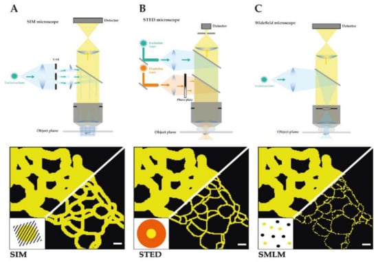- Schermelleh, L.; Ferrand, A.; Huser, T.; Eggeling, C.; Sauer, M.; Biehlmaier, O.; Drummen, G.P.C. Super-resolution microscopy demystified. Nat. Cell Biol. 2019, 21, 72–84. [Google Scholar] [CrossRef] [PubMed]