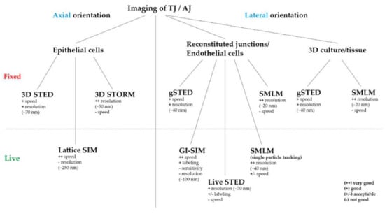 Practicable overview of the ideally used SRM technique for TJ and AJ imaging regarding the axial or lateral direction of the junction, the system (epi-, endothelial cells/fibroblasts/tissue), different labeling (fluorescent proteins/antibodies) and imaging (fixed/live) approaches.