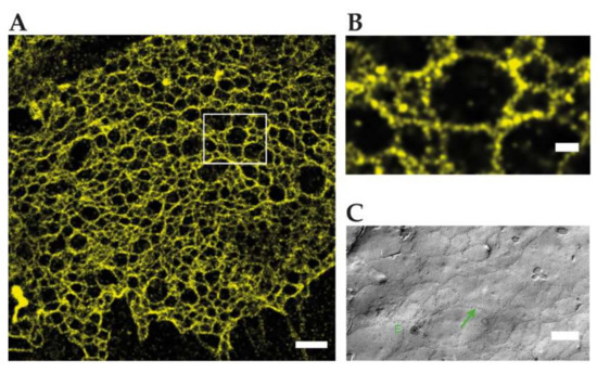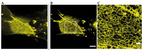 Reconstituted TJ networks formed by claudin3-YFP in HEK293 cells imaged by using SMLM (adapted from Kaufmann et al. 2012 []); (A) localization microscopy image of the region marked in the conventional wide-field fluorescence image with a mean effective optical resolution 48 nm. Scale bar: 1 µm; (B) magnification of claudin-3-YFP in HEK293 cells. Scale bar: 200 nm; (C) FFEM of claudin-5-YFP/claudin-3-YFP cotransfected HEK293 cells. Scale bar: 250 nm.