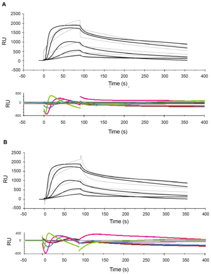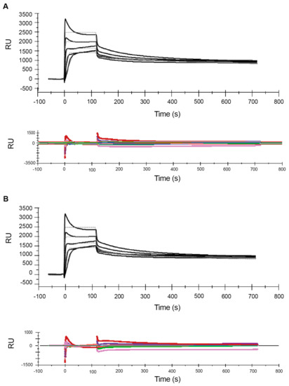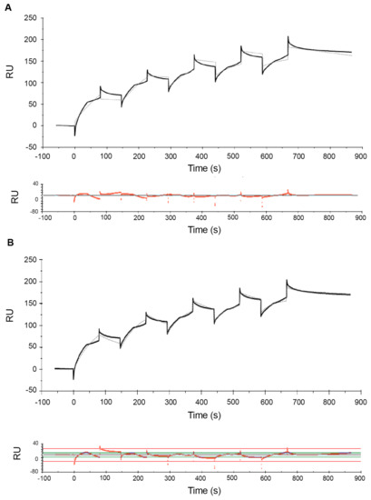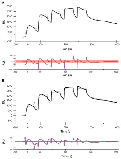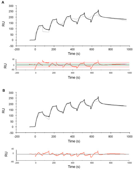 - Karlsson, R.; Katsamba, P.S.; Nordin, H.; Pol, E.; Myszka, D.G. Analyzing a kinetic titration series using affinity biosensors. Anal. Biochem. 2006, 349, 136–147. [Google Scholar] [CrossRef]