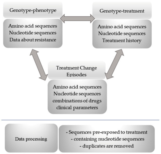 Datasets were compiled using information from the STDB [20], which provides three distinct data point types: genotype–phenotype (i.e., Genotype Resistance (GR)), Genotype–Treatment (GT), and Treatment Change Episodes (TCE). Details of these three data types are given in Figure 3. GT data, except for information on resistance, included treatment history for each patient, i.e., a set of all drugs ever taken by the patient from the start of any therapy. TCE data, which were provided in XML format, contained detailed information on the applied therapy, i.e., the starting point, the duration of each episode of treatment, and the set of drugs taken by the patient in the current treatment episode. These data also included information on the nucleotide sequences from the patient at a fixed time, viral load, and the number of CD4+ cells as an indicator of therapy effectiveness. Each file with TCE usually contained some treatment episodes distinguished by the set of drugs. TCE data did not include information on the resistance to each drug and the complete list of drugs ever taken by a patient. We processed the data of the three types mentioned above (see also Figure 3). Data processing involved three stages: (1) matching data of GR and GT types; (2) selection of only those isolates for which nucleotide sequences were available; and (3) selection of isolates pre-exposed to therapy and removal of duplicates.