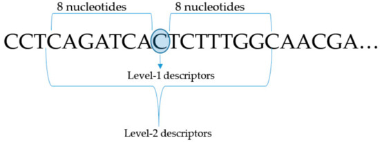 In our method, we used a modified naïve Bayesian classifier implemented in the PASS program [19,21,24]. Based on our previous experience in building models of HIV-1 resistance based on nucleotide sequences, we used short nucleotides as descriptors in the PASS algorithm. We represented the nucleotide sequence of each isolate as a set of short nucleotide fragments. Short fragments were created by moving along the sequence and cutting eight nucleotides before and after the center position. Each central position was at a distance of four nucleotides from the previous center. The nucleotide in the current central position and nucleotides before and after that position comprised the descriptor of the Multilevel Neighborhoods of the Nucleotide (MNN). Therefore, each first level MNN descriptor corresponded to the fragment of 9 nucleotides; each second level MNN descriptor corresponded to the fragment of 17 nucleotides, and so on. In this study, we used the MNN descriptors of the first and second levels (Figure 4). Second level descriptors were stored in the knowledge base during the training procedure with data about a particular sample belonging to a specific class.