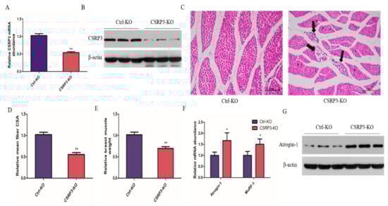 To examine the effect of CSRP3 on skeletal muscle development, chicks were injected with lentivirus expressing siRNA targeting CSRP3 for CSRP3-knockdown (CSRP3-KO); controls (control-knockdown, Ctrl-KO) were established in parallel. We confirmed that CSRP3-KO in chick breast muscle resulted in significantly decreased CSRP3 mRNA and protein levels (Figure 1A,B). H&E staining revealed a general decrease in myofiber size and the presence of necrotic myofibers in the CSRP3-KO group (Figure 1C). The muscle weight and muscle fiber cross-sectional area in the CSRP3-KO group were significantly lower than those in controls (Figure 1D,E). We next investigated the effect of CSRP3-KO on atrophy-related genes in skeletal muscle and found that CSRP3-KO significantly increased Atrogin-1 and MuRF-1 mRNA levels and Atrogin-1 protein expression (Figure 1F,G). These data suggested that CSRP3 participates in regulating muscular atrophy of skeletal muscle.