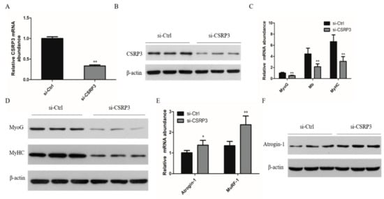 To further determine the effect of CSRP3 on the development of chicken skeletal muscle, we silenced CSRP3 in chicken primary myoblasts to investigate the effect on myoblast differentiation (Figure 2A,B). We found that CSRP3 siRNA decreased the mRNA levels of three myogenic marker genes including myogenin (MyoG), myoglobin (Mb), and myosin heavy chain (MyHC) and the protein level of MyoG and MyHC compared with controls (Figure 2C,D). In addition, we found that CSRP3 silencing resulted in significantly increased expression of atrophy-related genes including Atrogin-1 and MuRF-1 (Figure 2E,F). These data suggested that CSRP3 is involved in regulating the development of chicken skeletal muscle.