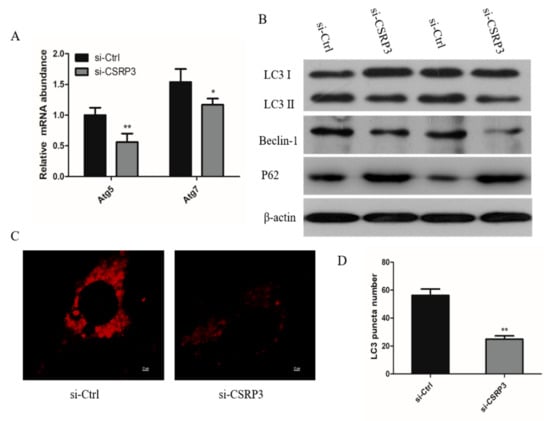 We next examined the potential function of CSRP3 in autophagy by knockdown of CSRP3 in chicken myoblasts. Cells transfected with CSRP3-siRNA showed significantly decreased expression of ATG5 and ATG7 mRNA (Figure 4A). Then, we monitored the autophagy flux by examination of endogenous LC3, P62, and Beclin-1, and all of them were decreased in CSRP3-silenced cells compared with controls (Figure 4B). Immunofluorescence showed that the numbers of LC3 small punta were significantly reduced after CSRP3 was silenced, and no ring-shaped structures were observed in CSRP3-silenced cells (Figure 4C,D). These results indicated that CSRP3 regulates autophagy flux in muscle cells.