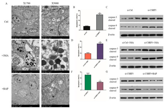 Previous studies have shown that autophagy is also associated with apoptosis. We thus used the autophagy inhibitor 3-methyl adenine (3-MA) and induced rapamycin (RAP) to inhibit and promote autophagy in cells, respectively. We found that the numbers of apoptotic bodies increased significantly after adding 3MA, but the number of apoptotic bodies in the control group and the RAP group was very small (Figure 6A). Flow cytometry demonstrated that the percentage of apoptotic cells increased significantly in CSRP3-silenced cells compared with controls (Figure 6B). In addition, CSRP3 silencing significantly increased the levels of cleaved caspase-3 and caspase-9 protein expression (Figure 6C). We next further investigated the regulatory mechanism of CSRP3 in apoptosis. We found that apoptosis of cells with CSRP3 silencing was further aggravated with 3MA treatment (Figure 6D,E). Notably, the apoptosis rate of CSRP3 silenced cells was reduced after incubation with RAP (Figure 6F,G). These results suggested that apoptosis induced by silencing of CSRP3 may be due to impaired autophagy.