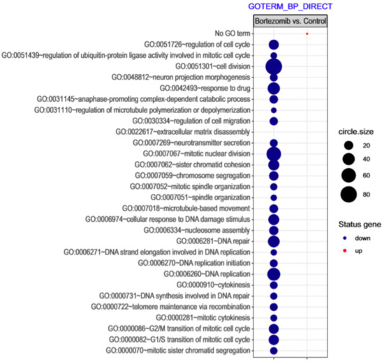 The bubble plot with changed biological processes assigned according to Gene Ontology (GO) classification in bortezomib-treated PC12-derived nerve cells compared to the control cells. Genes assigned to individual processes fulfilling the criteria: Adjusted p < 0.05, method = Benjamini, and minimum number of genes per group = 5, are presented. The bubble size indicates the number of genes represented in the corresponding annotation.