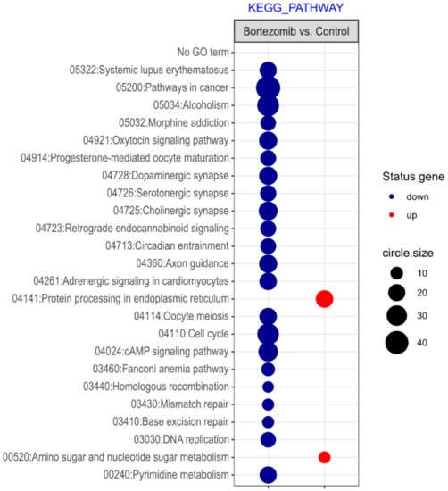 The bubble plot with changed pathways assigned according to the KEGG Pathway Database in bortezomib-treated PC12-derived nerve cells compared to the control cells. Genes assigned to individual processes fulfilling the criteria: Adjusted p < 0.05, method = Benjamini, and minimum number of genes per group = 5, are presented. The bubble size indicates the number of genes represented in the corresponding annotation.
