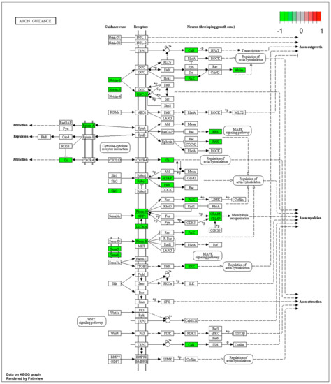 Graph of genes and processes involved in the pathway 04360.Axon guidance. The scheme shows genes and relationships between them. Additionally, the diagram indicates the genes up- or downregulated in our analysis. Solid arrows indicate a direct effect on specific gene expression while dotted arrows indicate gene involvement in a process or pathway. This allows an in-depth understanding of the effects of specific gene dysregulation on the selected process.