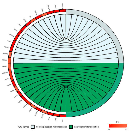Circus plot shows the dysregulated processes (neuron projection morphogenesis and neurotransmitter secretion) and their associated genes after bortezomib-treatment in PC12-derived nerve cells. The level of expression for each gene is marked using red color (fold change −3 to −2).