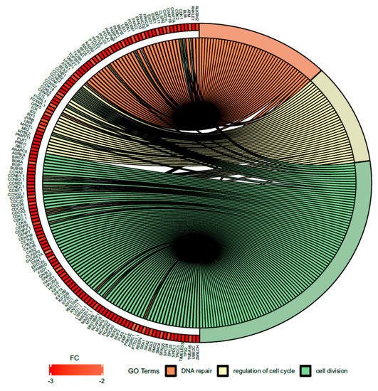 Circus plot shows the dysregulated processes (DNA repair, regulation of cell cycle, cell division) and their associated genes after bortezomib-treatment in PC12-derived nerve cells. The level of expression for each gene is marked using red color (fold change −3 to −2). Ribbons connecting areas of the Circus plots also indicate shared genes between groups.