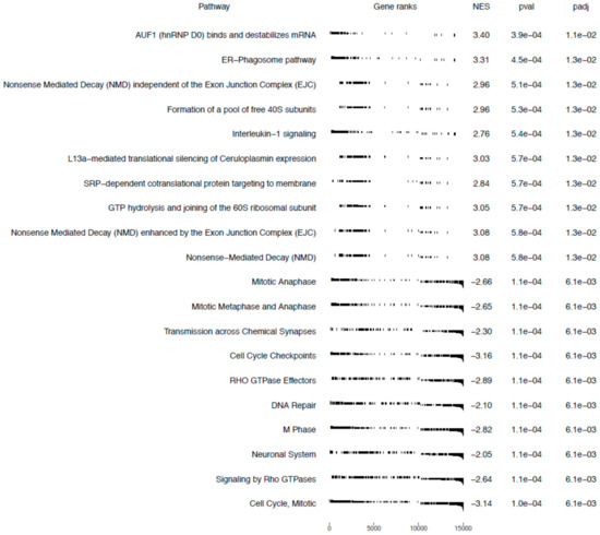 The Gene Set Enrichment Analysis (GSEA) method focuses on gene sets, that is, groups of genes that participate in a common biological function, chromosomal location, or regulation. Therefore, to more precisely investigate the biological influence of bortezomib on PC12-derived nerve cells, we carried out GSEA to identify altered pathways in bortezomib-treated PC12-derived nerve cells vs. control cells. According to the gene set enrichment analysis, 10 gene sets with a positive correlation were detected in bortezomib-treated cells and 10 gene sets with a negative correlation. Cell cycle checkpoints, DNA repair, and neuronal system-related genes were significantly downregulated in PC12-derived nerve cells treated with bortezomib for 24 h (false discovery rate (FDR) = 0.61%) (Figure 8).