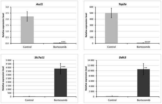 Real-time quantitation of selected genes Ascl1, Top2a, Slc7a11, Ddit3 in PC12-derived nerve cells after bortezomib-treatment, and in the control cells. Data are presented as the mean ± SD (n = 3). ** p < 0.002; *** p < 0.001; **** p < 0.0009 compared with the control cells.