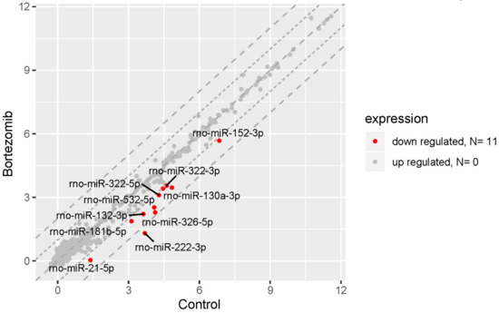The result of miRNA expression analysis demonstrated only 11 significantly downregulated miRNAs (at least two fold) in bortezomib-treated PC12-derived nerve vs. control cells (Figure 10).