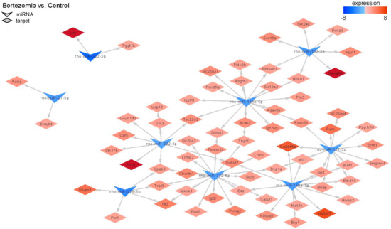 MiRNAs regulate gene expression, therefore we decided to conduct an analysis comparing the outcomes of miRNA microarray expression data to the obtained mRNA data. Only this method shows the real impact of miRNAs on their target genes. Figure 11 shows changes in the expression of 9 miRNAs; target genes and changes in their expression in bortezomib-treated PC12-derived nerve compared to control cells. The identified miRNAs regulate various processes: Cell cycle, apoptotic process, regulation of cell growth.