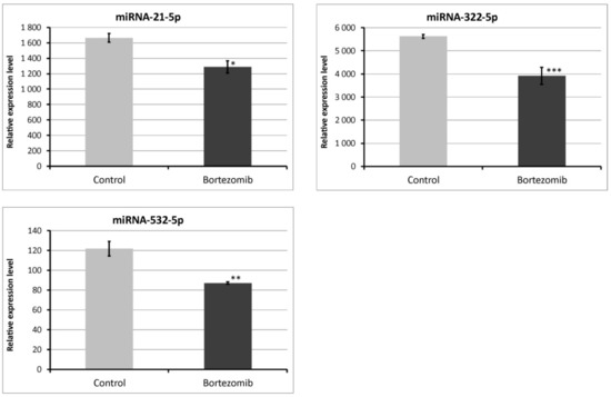 Real-time quantitation of selected miRNAs (miRNA-21-5p; miRNA322-5p; miRNA-532-5p) in PC12-derived nerve cells after bortezomib-treatment, and in control cells. Data are presented as the mean ± SD (n = 3). *p < 0.05; ** p < 0.01; *** p < 0.002 compared with the control cells.