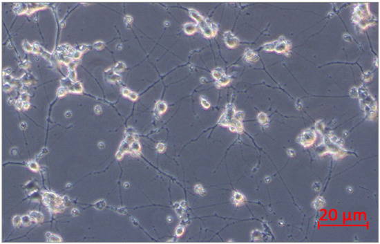 PC12 pheochromocytoma cells (rat, ATCC, Manassas, VA, USA) were used in this study. The selected cell line is often used as a reliable model of induced peripheral neuropathy and neurotoxicity [35,36,37,38,39]. The cells respond reversibly to nerve growth factor (NGF) by induction of the neuronal phenotype when plated on collagen IV coated culture flasks. PC12 cells were incubated for growth in Corning® T-75 flasks (Corning, MO, USA) in RPMI-1640 (ATCC, Manassas, VO, USA) medium modified to contain 2 mM L-glutamine, 10 mM HEPES, 1 mM sodium pyruvate, 4500 mg/L glucose, and 1500 mg/L sodium bicarbonate, streptomycin (100 µg/mL), penicillin (100 U/mL) with 5% fetal bovine serum (FBS) (Sigma Aldrich, St. Louis, MO, USA) and 10% heat-inactivated horse serum (HS) (Sigma Aldrich, St. Louis, MO, USA) at 37 °C in saturated humidity atmosphere containing 5% CO2. The medium was changed every 2–3 days. PC12 cell differentiation into neurons was conducted according to the protocol described by Popova et al. [39]. PC12 cells were incubated at a density of 2x106 cells/well in 6-well culture plates on collagen IV coated (Corning, MO, USA) in RPMI-1640 medium supplemented with 2 mM L-glutamine, 10 mM HEPES, 1 mM sodium pyruvate, 4500 mg/L glucose, and 1500 mg/L sodium bicarbonate, streptomycin (100 µg/mL), penicillin (100 U/mL), 1% HS, and 100 ng/mL NGF (Sigma Aldrich, St. Louis, MO, USA). Every second day, half of the medium/well was changed. After 10 days, differentiated PC12 cells into neurons were received (Figure 13). Next, neurons were not treated (control) or treated with bortezomib 50 nM/L (Cell Signalling Technology, Danvers, MA, USA) and collected after 24 h of incubation. The cells were used to isolate mRNA and miRNA.
