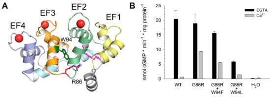 Three-dimensional structure of Ca2+-loaded Guanylate Cyclase activating protein 1 (GCAP1) G86R (A) and Guanylate Cyclase (GC) regulation by GCAP1 WT, G86R, G86R+W94F and G86R+W94L variants expressed in nmol cGMP * min−1 * mg protein−1 (B). (A) Protein structure is represented as a cartoon, Ca2+ ions are displayed as red spheres, the myristoyl group, R86 and W94 are shown as sticks and colored magenta, red and green, respectively, with N atoms colored blue. C-terminal helix is depicted in grey, EF1 in yellow, EF2 in green, EF3 in orange, EF4 in blue and N-terminal helices in cyan. (B) Cell membranes containing GC were incubated with ~10 µM GCAP1 variants in the presence of 1 mM Mg2+ and 2 mM ethylene glycol-bis(β-aminoethyl ether)-N,N,N′,N′-tetraacetic acid (EGTA) (black) or 33 µM free Ca2+ (grey), H2O was used as control. Data refer to the average and standard deviation of three independent replicas.
