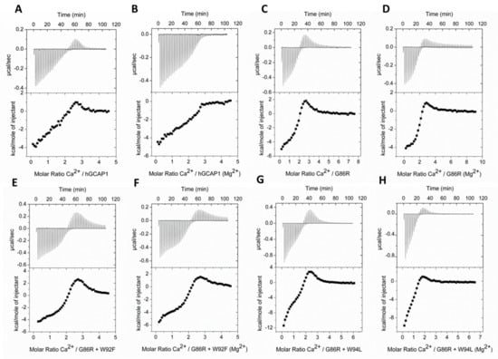 Ion binding to GCAP1 variants monitored by Isothermal Titration Calorimetry (ITC). Representative Ca2+ titrations of 20 µM GCAP1 variants in the absence (panels A, C, E and G) and in the presence of 1 mM Mg2+ (panels B, D, F and H). (Representative Mg2+-titrations of 20 µM GCAP1 G86R+W94F and G86R+W94L are shown as Supplementary Figure S3A,B). Panels represent heat pulses and molar enthalpy changes corresponding to each injection. Ca2+-titration data was fitted to a three-sites binding model, while Mg2+-titration data was fitted to a two-sites binding model yielding macroscopic dissociation constants (KD) and enthalpy changes (ΔH) for each binding site, listed in Table 1.