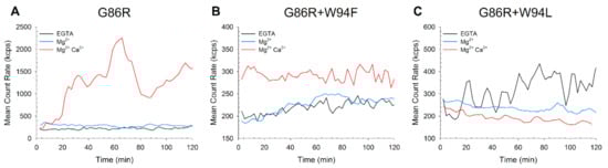 While the count rate of apo and Mg2+-bound G86R fluctuated around 200–300 kcps during the 2 h of DLS measurements (Figure 3A), the Ca2+-loaded form showed a constant increase in the count rate, which ranged from 200 to 2300 kcps in approximately 60 min. The count rate was characterized by broad oscillations. Double mutant G86R+W94F showed a slow increase in count rate (Figure 3B) within 2 h both in the absence of ions (210 to 260 kcps) and upon Mg2+-binding (190 to 240 kcps in <1 h). On the other hand, the Ca2+-loaded form oscillated around 300 kcps. Interestingly, the double mutant G86R+W94L showed a slight decrease of the count rate (Figure 3C) in the experimental time (∆ count rate <40 kcps) both in the presence of Mg2+ and Ca2+, while the apo form exhibited an increase in count rate from 250 to 400 kcps and significant oscillations.