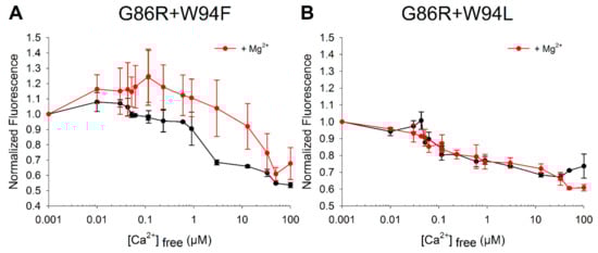 Overall, the presence of Mg2+ lowered the Ca2+-affinity of all tested forms, though to a different extent. Indeed, WT showed an almost four-fold reduction in the overall apparent affinity in the presence of Mg2+ (KDapp ~200 nM vs. ~52 nM), while G86R just a one-and-a-half-fold reduction (KDapp ~243 nM vs. ~167 nM). As to the double mutants, G86R+W94F showed the smallest reduction (KDapp ~992 nM vs. ~741 nM), while G86R+W94L exhibited the largest decrease in Ca2+-affinity, exceeding fourty-fold change (KDapp ~3.1 µM vs. ~73 nM) (Table 1).