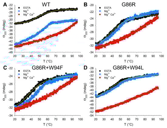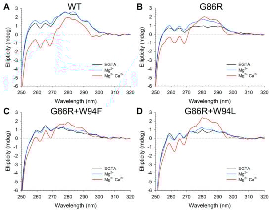 Moreover, at odds with the WT and both double mutants, the conformation of the G86R variant resulted to be sensitive to Mg2+ as observed by the increased signal mostly in the Y band (Figure 5B–D). Ca2+ induced a conformational change in all three variants as clearly shown by the increase of the signal in the Y-W bands and a decrease in the F band, where the signal became more negative. Specifically, mutant G86R and double mutant G86R+W94L showed a WT-like fine structure in the negative F band but a more pronounced positive signal in the Y-W bands, while double mutant G86R+W94F exhibited a positive spectrum in all three aromatic regions, as partly expected by the insertion of an F residue and the simultaneous deletion of the native W.